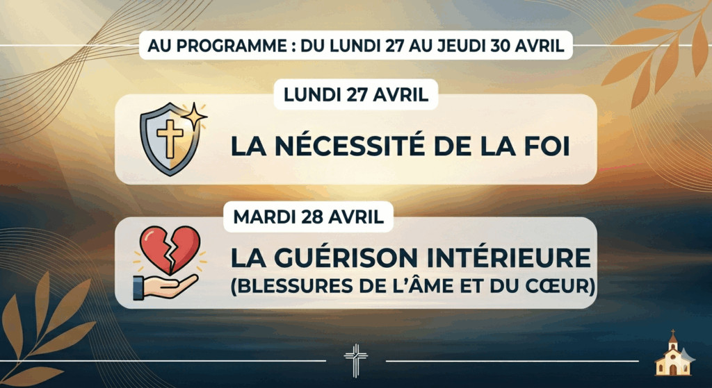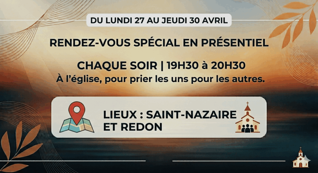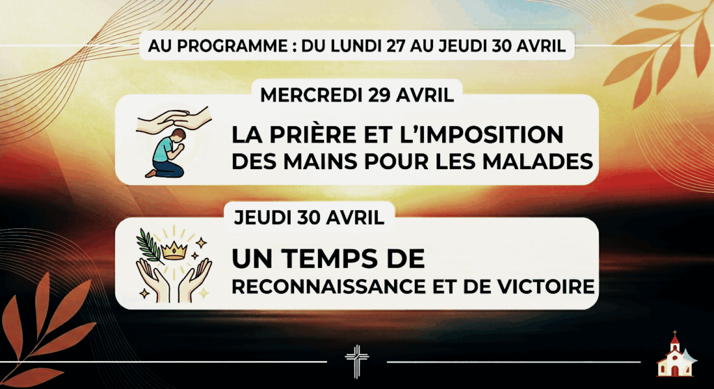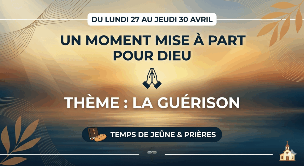 Du lundi 27 au jeudi 30 avril, nous vous invitons à un moment mise à part pour Dieu, dans un temps de jeûne et prières.